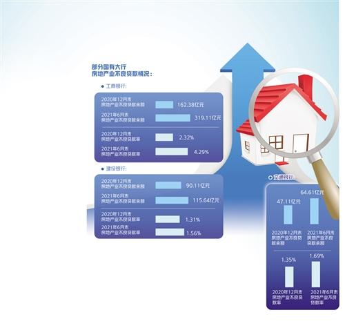 從國有大行已披露數(shù)據(jù)看,截至2021年6月末,中國工商銀行、中國建設(shè)銀行、交通銀行的房地產(chǎn)業(yè)不良貸款余額分別為319.11億元、115.64億元、64.61億元,較去年年末上升156.73億元、25.53億元、17.50億元;房地產(chǎn)業(yè)不良貸款率分別為4.29%、1.56%、1.69%,較去年年末上升1.97個百分點(diǎn)、0.25個百分點(diǎn)、0.34個百分點(diǎn)。