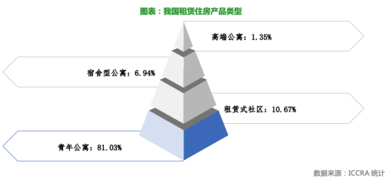 報告指出,我國租賃住房類型整體呈現(xiàn)出明顯的“正金字塔”形態(tài):滿足年輕人需求的青年公寓占比最大,超過80%;其次是滿足新市民需求的租賃式社區(qū),占比超過10%;面對企業(yè)基層員工的宿舍型公寓占比8.62%;服務(wù)式公寓比例僅為1.35%。