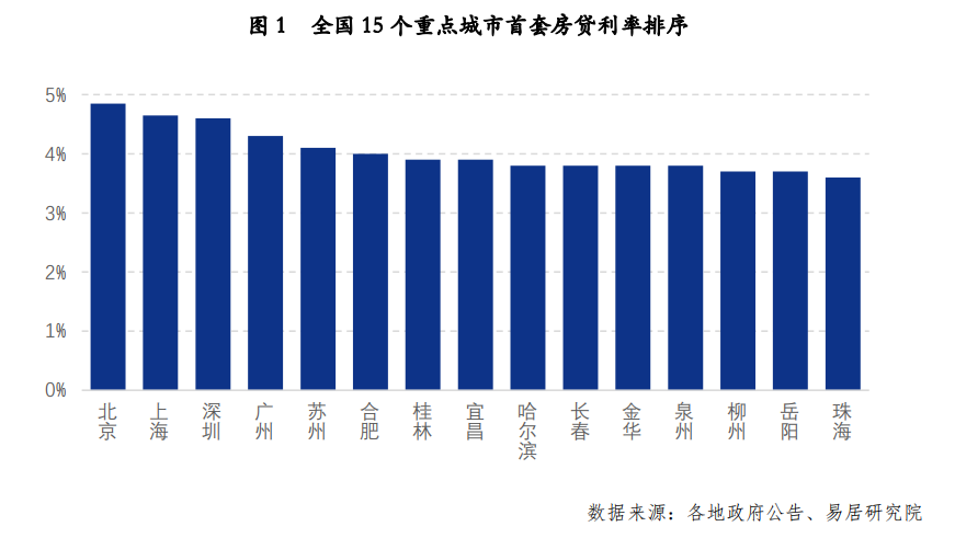 但具體看這15個城市的排序情況,各城市的實際首套房貸利率呈現了較大差異。其中北上深廣四個一線城市房貸利率最高,分別為4.85%、4.65%、4.60%和4.30%。而其他城市均低 4.1%的水平。易居房地產研究院統(tǒng)計顯示,有9個城市房貸利率低于4%的水平,包括弱二線城市和很多三四線城市。