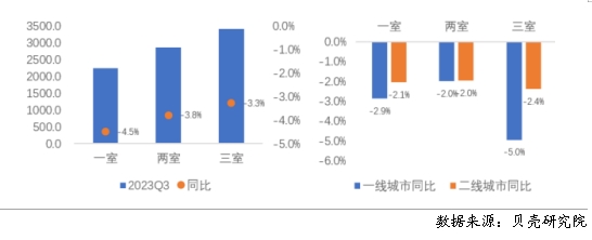 分不同居室來看,全國重點40城中一居室占比同比下跌4.5%,同比跌幅最大;分不同能級城市來看,一線、二線城市三居室套均租金同比跌幅最大,其次為一居室。