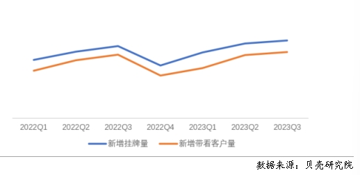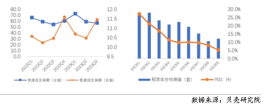 根據(jù)貝殼研究院數(shù)據(jù),全國重點40城三季度房客源成交周期分別為56.7、11.5天,房源成交周期環(huán)比減少2.1天,同比增加2.7天;客源成交周期環(huán)比延長1天,同比延長1天。隨著個人租賃房源供應(yīng)的增加,疊加保障性租賃住房、市場化集中式租賃房源的增加,個人業(yè)主出租房源出租速度減緩。從庫存房源來看,今年1-9月租賃庫存房源量均呈現(xiàn)同比增加的趨勢,與此同時,租客租房面臨的選擇項增多,租客對于租賃房源可選類型和房源量均有增加。