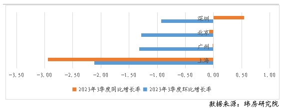 三季度,一線城市租金成交價同比跌幅高于二線城市,一線城市除北京微漲外,上海、廣州、深圳均同比下跌