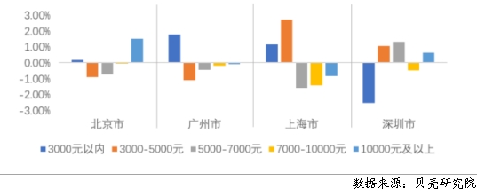 貝殼研究院數(shù)據(jù)顯示,一線城市呈現(xiàn)不同程度的重心下移,同時北京、深圳還呈現(xiàn)出延遲購房“購轉(zhuǎn)租”的特征,高套均支出區(qū)間的租賃房源成交增加。上海和廣州租賃重心下移態(tài)勢明顯。上海套均租金5000元以內(nèi)的成交占比增加了將近4個百分點,5000元以上的占比均呈現(xiàn)減少趨勢,尤其是套均租金在5000-10000元區(qū)間的房源占比;廣州套均租金在3000元以內(nèi)的增加了1.8個百分點,3000元以上的均呈現(xiàn)減少趨勢。