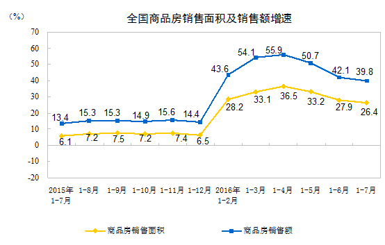 1-7月份,商品房銷售面積75760萬平方米,同比增長(zhǎng)26.4%,增速比1-6月份回落1.5個(gè)百分點(diǎn)。其中,住宅銷售面積增長(zhǎng)26.7%,辦公樓銷售面積增長(zhǎng)41.3%,商業(yè)營(yíng)業(yè)用房銷售面積增長(zhǎng)15.5%。商品房銷售額57569億元,增長(zhǎng)39.8%,增速回落2.3個(gè)百分點(diǎn)。其中,住宅銷售額增長(zhǎng)41.2%,辦公樓銷售額增長(zhǎng)65.3%,商業(yè)營(yíng)業(yè)用房銷售額增長(zhǎng)17.6%。