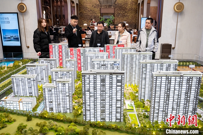 圖為3月7日,太原一家房地產(chǎn)公司新開樓盤吸引購房者關(guān)注。 中新社記者 韋亮 攝