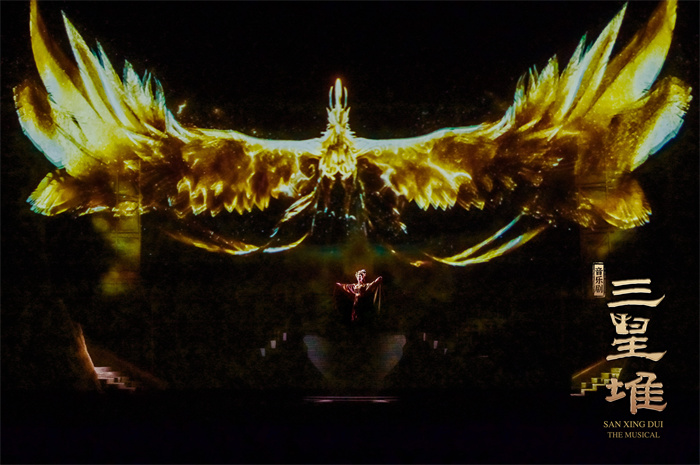 舞美設(shè)計由倫敦著名設(shè)計師摩根·拉知(Morgan Large)擔(dān)任,他曾獲2018年英國戲劇獎最佳設(shè)計獎和4次奧利弗獎、參與過《修女也瘋狂》《周日戀曲》等多部著名劇目舞美設(shè)計。舞美團(tuán)隊不僅力圖在色彩和道具上還原三千年前青銅王朝的璀璨與輝煌,還通過兩百余臺電腦燈呈現(xiàn)不同場景的光影效果。觀眾將非常幸運地首次在音樂劇舞臺上,一次性看到青銅大立人、青銅大面具、青銅神樹等極具三星堆代表性文物的復(fù)刻版,加上極具沖擊力和感染力的多媒體技術(shù),生動展現(xiàn)了三千年前古蜀國的璀璨與輝煌。