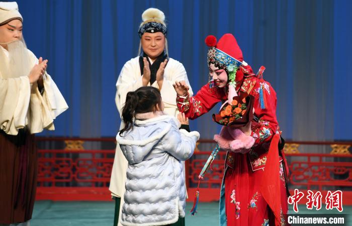 演出結(jié)束后,該劇主演劉泳渤謝幕間隙與一名走上舞臺(tái)的女童互動(dòng)。 中新網(wǎng)記者劉可耕攝