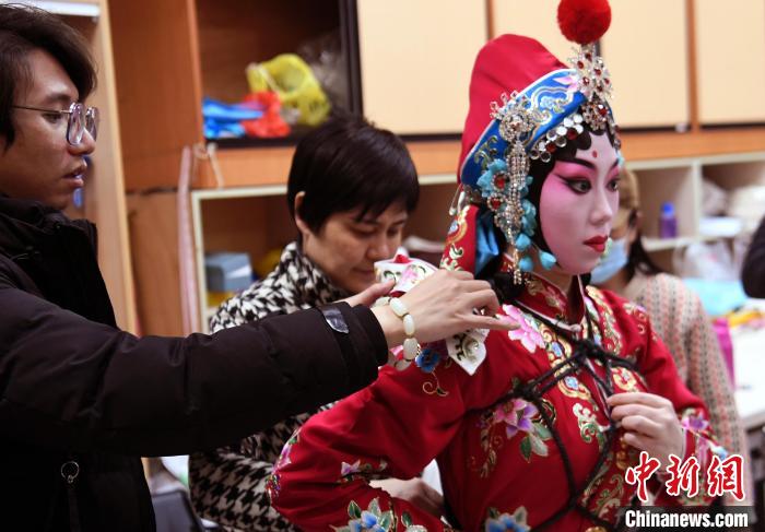 演出開(kāi)始前,該劇主演劉泳渤在工作人員的協(xié)助下調(diào)整戲裝。 中新網(wǎng)記者劉可耕攝