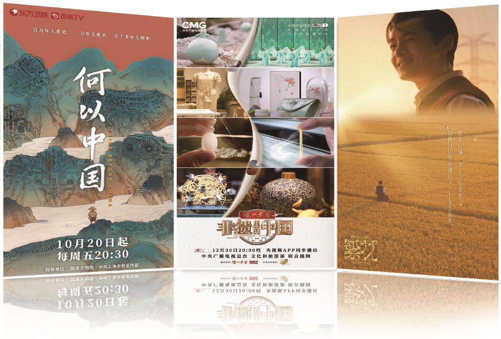 左起依次為《何以中國》《非遺里的中國》《繁花》海報(bào)。