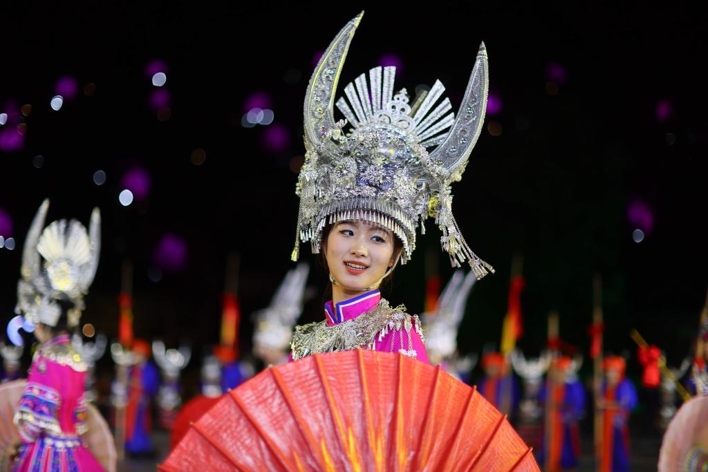 9月20日晚,演員在貴州省雷山縣大塘鎮(zhèn)表演苗族歌舞詩劇《仰歐?!?。新華社記者 楊文斌 攝