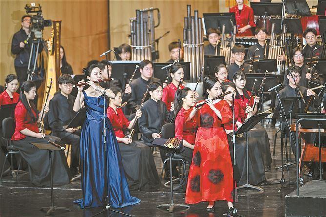 展現(xiàn)“潮”與“年輕態(tài)”的當(dāng)代民樂(lè)作品——雙竹笛協(xié)奏曲《熱情與冷漠的邂逅》融入了南音元素。(廈門(mén)日?qǐng)?bào)記者 林銘鴻 攝)