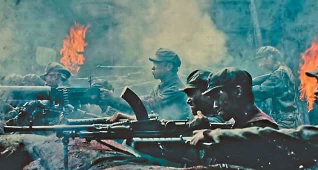 在《浴血榮光》中,陳力導(dǎo)演延續(xù)了其真實厚重、沉郁激越的影像風格,讓影像深度參與敘事,劇集對于不同的場景敘事采用了不同的影像風格。南昌起義、三壩河阻擊戰(zhàn)、井岡山叢林游擊戰(zhàn)等戰(zhàn)斗大場面,炮火紛飛、震撼人心;而與家庭相關(guān)的影像則趨向溫暖動人。