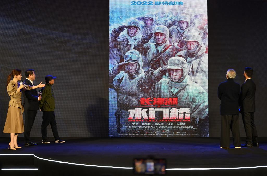 電影《長(zhǎng)津湖之水門(mén)橋》2021年在廈門(mén)舉行新聞發(fā)布會(huì),黃建新(左三)為總監(jiān)制。新華社記者 林善傳 攝