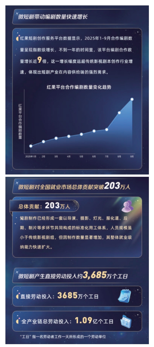 這不僅大幅提升了人力資源的利用效率,也為從業(yè)人員帶來了長期且穩(wěn)定的工作預期,吸引了大量人才涌入。以編劇為例,紅果短劇創(chuàng)作服務平臺數(shù)據(jù)顯示,2025年1-9月合作編劇數(shù)量呈現(xiàn)指數(shù)級增長,不到一年的時間里,平臺編劇合作數(shù)量增長近9倍,遠超傳統(tǒng)影視劇本創(chuàng)作行業(yè)增速。