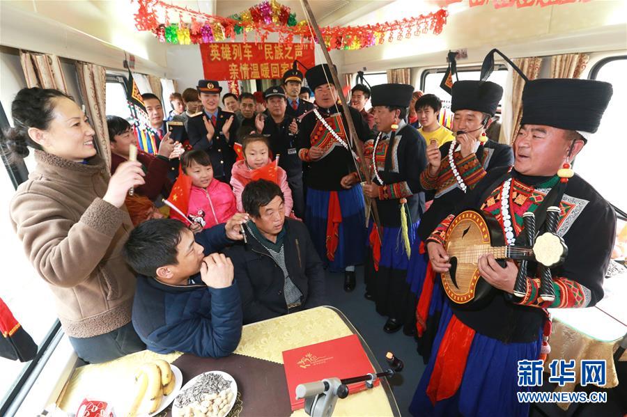 2月1日,彝族藝術(shù)家在K165次列車上為旅客表演。當(dāng)日,在西安鐵路局西安至昆明的K165次列車上,四川美姑縣原生態(tài)畢摩樂隊(duì)與西安客運(yùn)段職工民樂小分隊(duì)聯(lián)合舉辦“英雄列車民族之聲親情溫暖回家路”音樂會(huì),畢摩樂隊(duì)用口弦、哈門、木葉、瑪布等彝族民間樂器演奏的音樂為返鄉(xiāng)過年的旅客提前送上新年祝福。民間藝術(shù)家和列車乘務(wù)員還為旅客們送上“?!弊帧⒋郝?lián)。新華社發(fā)