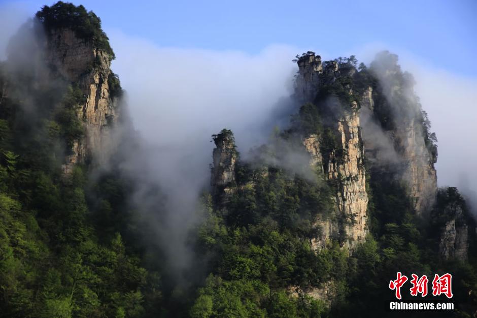 4月18日,雨過天晴的湖南張家界核心景區(qū)武陵源出現(xiàn)壯觀的“云瀑”景觀。雪白的濃云從峰林間向下翻騰,猶如天河傾瀉,氣勢磅礴。 吳勇兵 攝