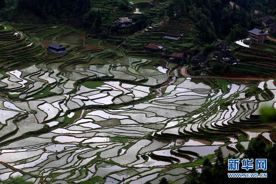 5月20日在廣西柳州市融水苗族自治縣桿洞鄉(xiāng)拍攝的梯田。廣西柳州市融水苗族自治縣桿洞鄉(xiāng)平均海拔780多米,是全縣高海拔鄉(xiāng)鎮(zhèn)之一。這里的梯田多在高山,人們稱(chēng)之為“天上糧倉(cāng)”。時(shí)下,“天上糧倉(cāng)”或儲(chǔ)水待插,或新秧初栽,如織錦一般美不勝收。新華社發(fā)(龍濤 攝)