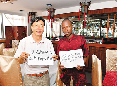 2月8日,在肯尼亞首都內(nèi)羅畢一家中國餐廳,餐廳經(jīng)營者祁溥瑩(左)和同事帕特里克·奧根切·奧托托展示各自的新年心愿。