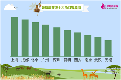 驢媽媽旅游網(wǎng)(以下簡稱,驢媽媽)數(shù)據(jù)顯示,今年暑期赴非游預(yù)訂人次同比上漲近2倍,赴非旅游熱情持續(xù)高漲,8月中上旬將迎來暑期出游最高峰。其中,追求獨特旅游體驗且有一定經(jīng)濟實力的25-40歲游客是赴非洲旅游的主力客群,該年齡段占比超7成;國內(nèi)城市中,上海、成都、北京、廣州、深圳、昆明、西安、南京、武漢、無錫成為十大熱門客源地。