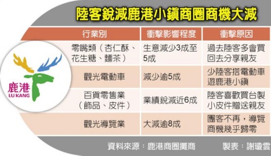 大陸游客減少后,臺灣旅游業(yè)“冷颼颼”。據(jù)臺灣《中國時報》報道,過去大陸游客團赴臺,若住宿中部準備出發(fā)前往日月潭途中,必定會先到訪鹿港小鎮(zhèn)。民意代表王惠美觀察,大陸游客不來之后,光是中山路上的店家生意就掉了一半。觀光電動車、賣小吃和皮件的攤商感受最深,曾經(jīng)忙到應接不暇的導覽解說員,現(xiàn)在只能主動出擊,通過民間協(xié)會發(fā)函邀請大陸游客組團赴臺交流參訪。