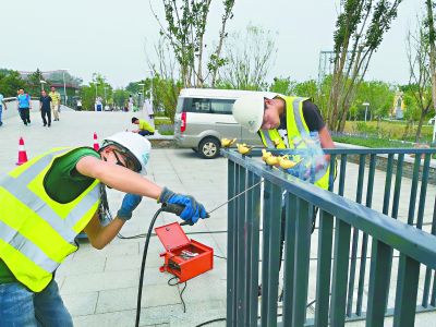 上午9時,安裝工作正在進(jìn)行,大約20只“小金鳥”陸續(xù)進(jìn)入最后的焊接階段?,F(xiàn)場施工負(fù)責(zé)人郭中戌師傅告訴記者,“和原來那批相比,小鳥的牢固程度增加了三倍以上?!庇浾呖吹剑X制鳥身下方連接著一個長而細(xì)的不銹鋼管,鋼管穿透護(hù)欄,欄桿上方的部分噴膠,欄桿下邊的部分?jǐn)Q緊螺絲后再加一層焊接。