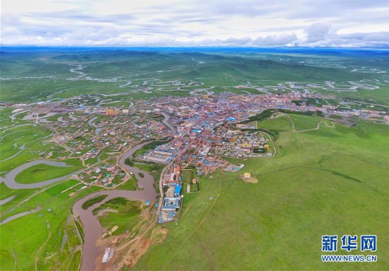 四川省阿壩藏族羌族自治州若爾蓋縣縣城、熱曲河(近)和黑河(遠)(6月17日攝,無人機照片)。 新華社記者 劉坤 攝