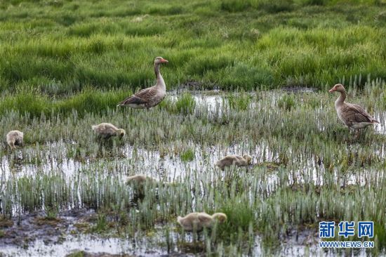 在位于四川省阿壩藏族羌族自治州若爾蓋縣西北部的花湖生態(tài)旅游區(qū),兩只灰雁帶著幾只幼鳥覓食(6月16日攝)。新華社記者 沈伯韓 攝
