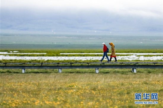 在位于四川省阿壩藏族羌族自治州若爾蓋縣西北部的花湖生態(tài)旅游區(qū),游人走在棧橋上欣賞美景(6月16日攝)。 新華社記者 沈伯韓 攝