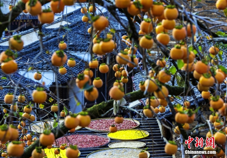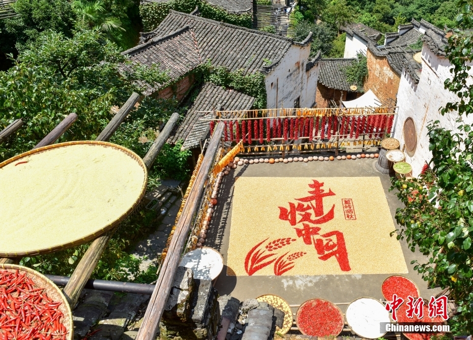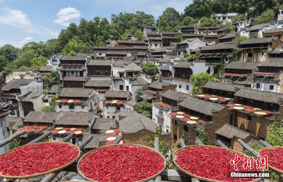 由于婺源的大多村莊是依山而建,平地較少,為將晾曬的食材安排的合理妥當(dāng),家家戶戶都展現(xiàn)了自家“空間管理”的高超技巧。圖為江西上饒婺源篁嶺古村,篁嶺獨(dú)具古韻的閣樓人家,處處可見絢爛的曬秋。稻谷、玉米、南瓜、豌豆、蘿卜曬在竹匾上,用橫木托著。