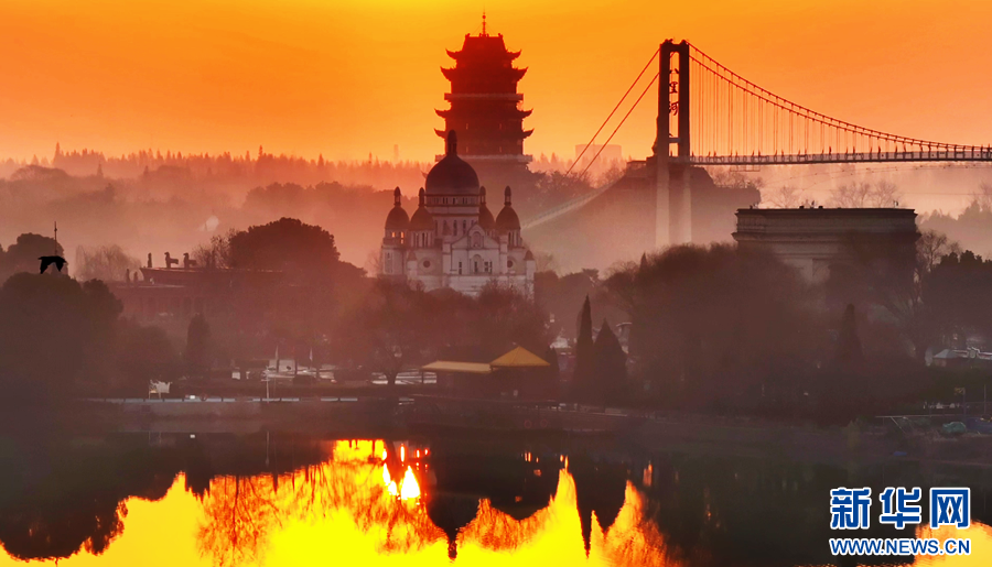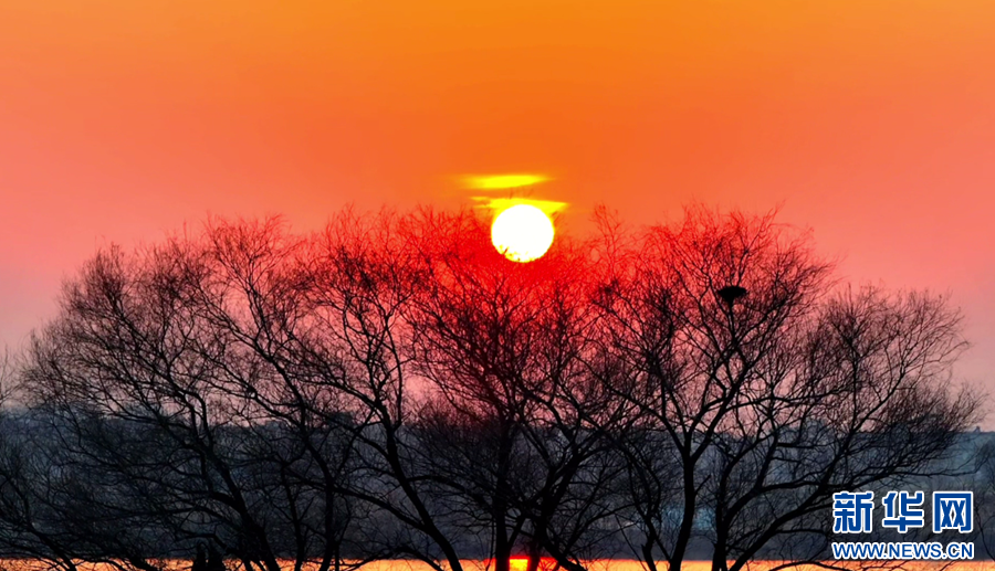 近日,在安徽省潁上縣八里河風景區(qū),隨著紅日冉冉升起,晨曦映照在水面上,水光瀲滟,交相輝映,宛如油畫一般,盡顯光影之美。新華網(wǎng)發(fā)(徐紅梅 攝)