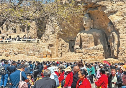 5月4日,游客在世界文化遺產(chǎn)云岡石窟游覽、參觀。