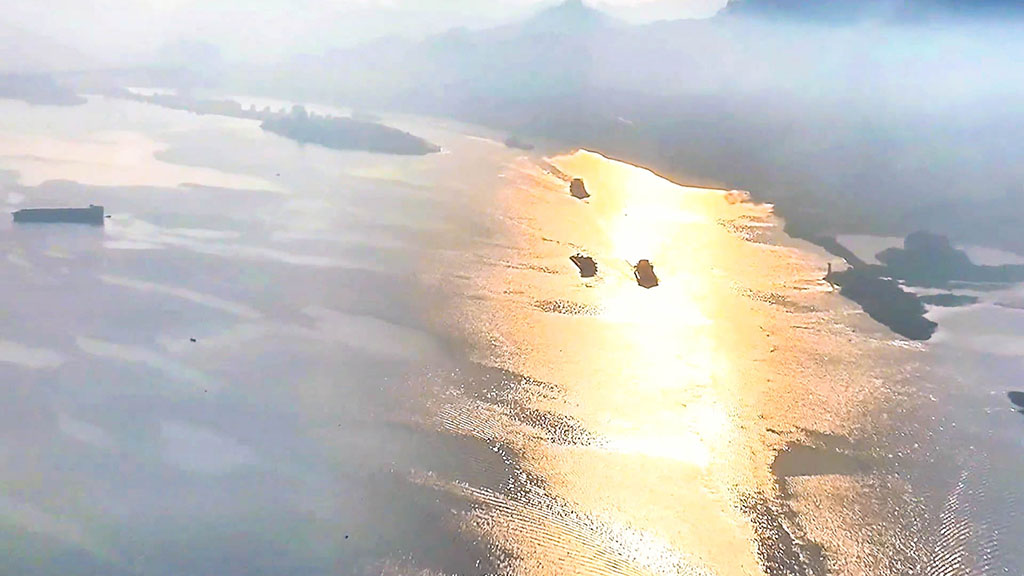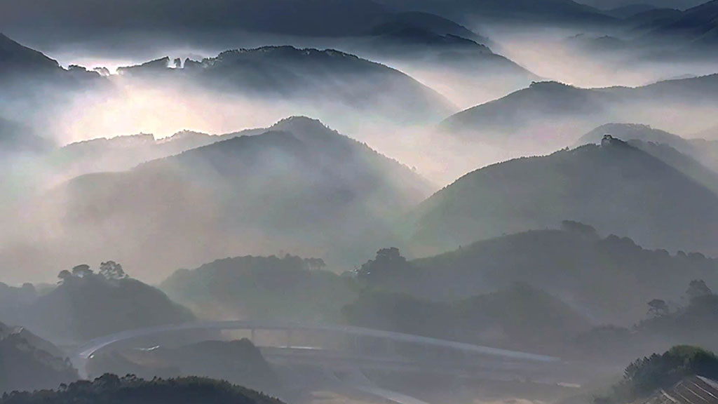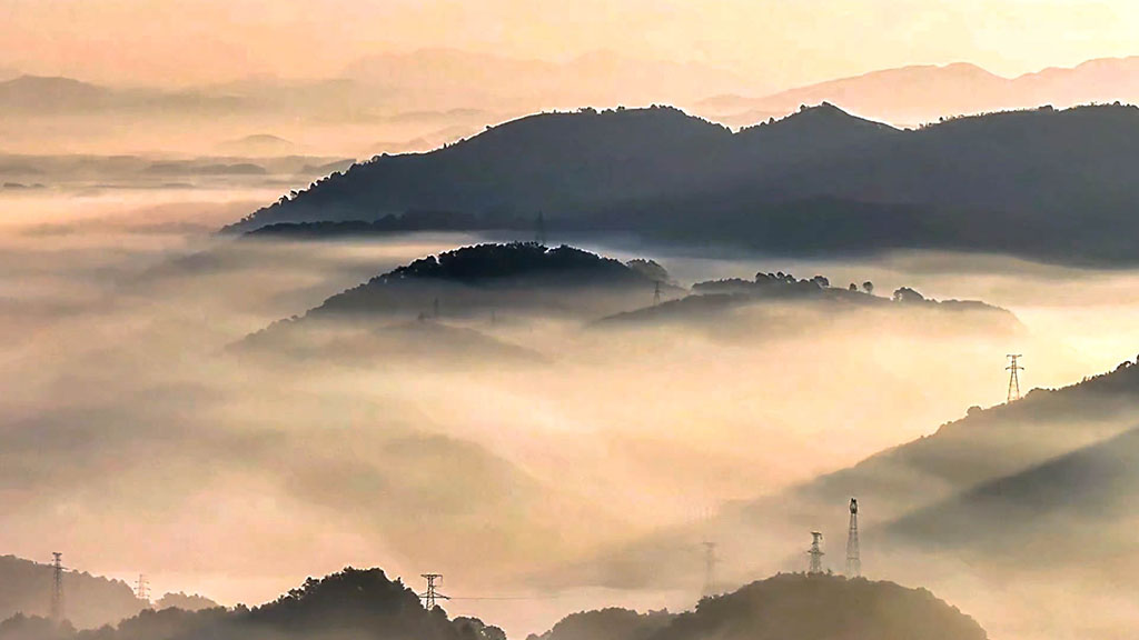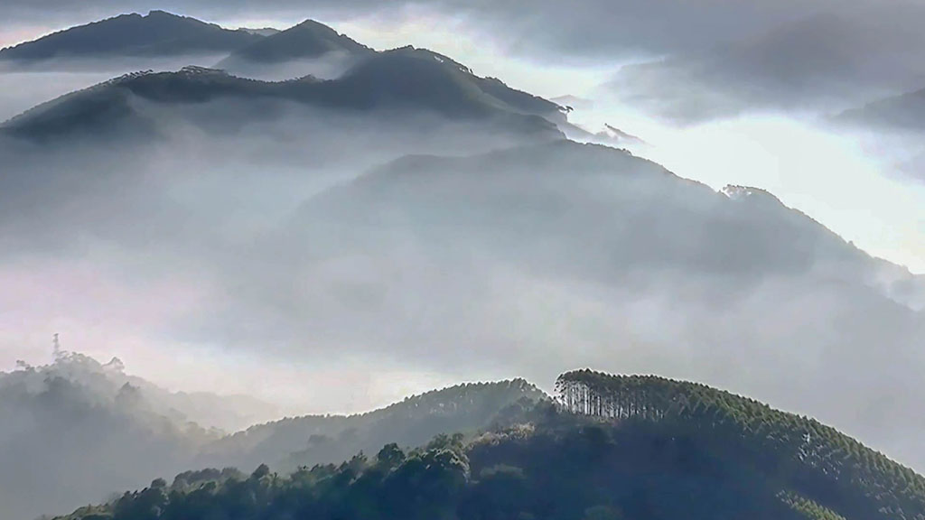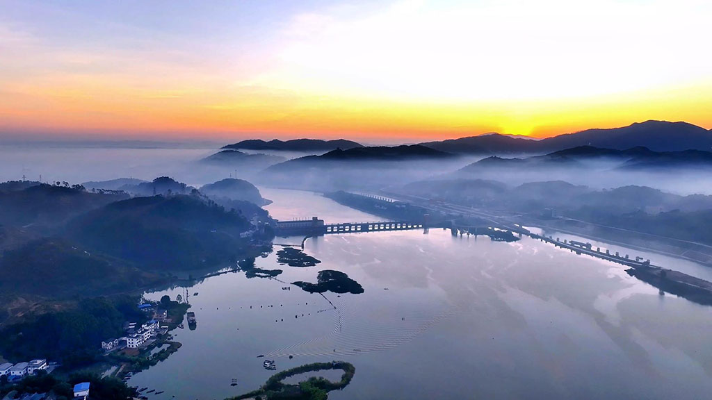連綿的山巒、氤氳的湖泊,散居的村落、蔥郁的林木,在薄霧籠罩下,西津湖宛如一幅流動(dòng)的水墨畫。
