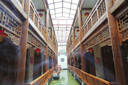 走進(jìn)觀山曉筑,別有洞天。建筑風(fēng)格古色古香,居中長(zhǎng)長(zhǎng)一池清泓,錦鯉、綠龜、卵石、荷花各自成趣。青磚墻雕既有北方莊重,水系綠植又有南方院落的靈致。房間裝修簡(jiǎn)約古樸,窗窗都有風(fēng)光。