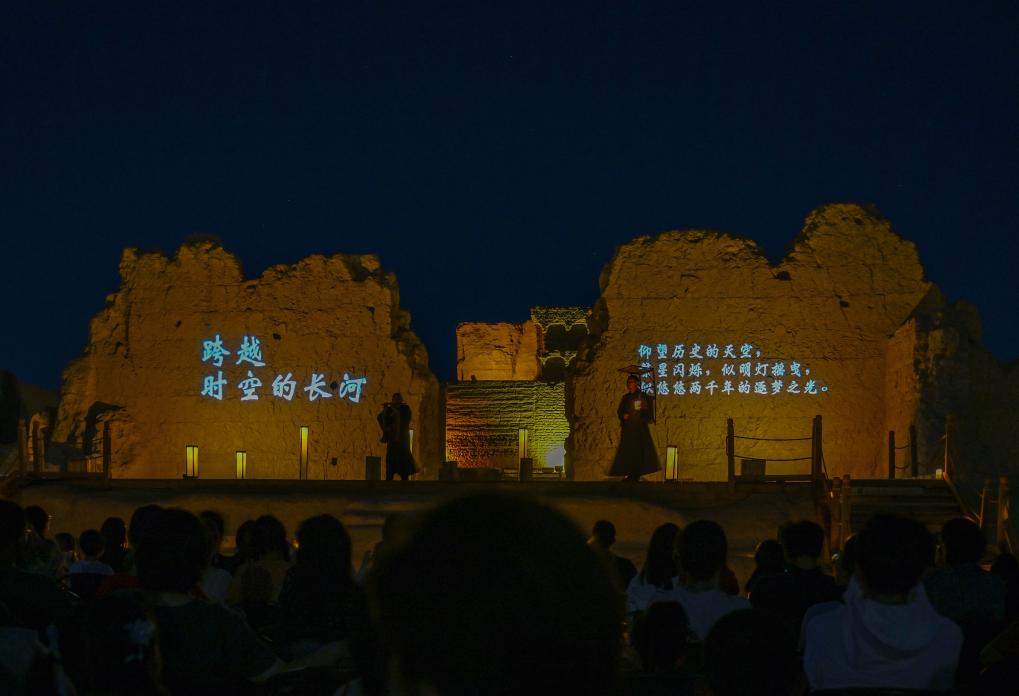 深藍色夜幕下,兩排戶外燈照亮高大殘舊的城墻。身著僧侶服飾的演員雙手合十、懷抱經卷,從夜色中走來。時鐘隨著他的朗誦,仿佛回轉到佛教鼎盛期的唐代西域。在舞臺前方席地而坐的游客,看得如醉如癡。