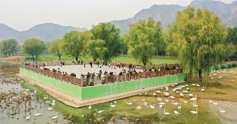 11月10日,運城市平陸縣三灣黃河濕地,成群野生大天鵝在這里棲息越冬,吸引眾多游客前來觀賞,展現(xiàn)出一幅人與自然和諧相處的美麗生態(tài)畫卷。近年來,平陸縣持續(xù)推進黃河沿岸濕地生態(tài)治理與環(huán)境修復,拉動當?shù)剞r(nóng)文旅產(chǎn)業(yè)深度融合,助推縣域經(jīng)濟高質(zhì)量發(fā)展。