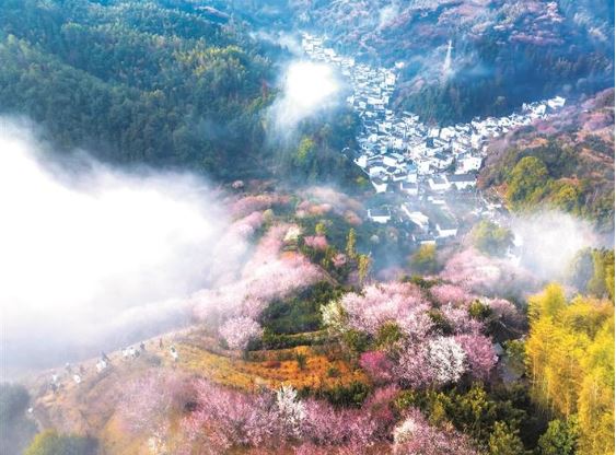 早春時(shí)節(jié),賣花漁村周邊漫山綻放的梅花與徽派村落民居相映成趣,景美如畫,吸引游客踏春賞花。