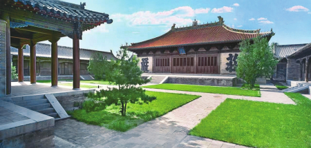 永安寺,原稱渾源州永安禪寺及神州大永安禪寺,俗稱“大寺”,始建于金,金元之交被火毀后重建,明、清以來均曾在當?shù)毓賳T倡導下續(xù)建與增修。該寺位于渾源古城東北隅,坐西北朝東南,本為以中軸線為主,東西軸各輔以跨院或偏院的五進場院空間大型寺廟建筑群,現(xiàn)僅存前院及東西跨院和中院主體建筑群,東西寬52米,南北深78米,占地面積4056平方米。寺內(nèi)現(xiàn)存文物建筑物7座、清代壁畫305.4平方米、建筑彩畫2118平方米,古代碑碣2方,石獅一對。主殿傳法正宗殿為元延祐二年(1315年)原構(gòu),是我國建筑史上廡殿頂建筑的杰作,殿內(nèi)滿堂水陸畫、建筑彩畫及殿頂五彩琉璃均保存完好且異常精美,聞名遐邇。