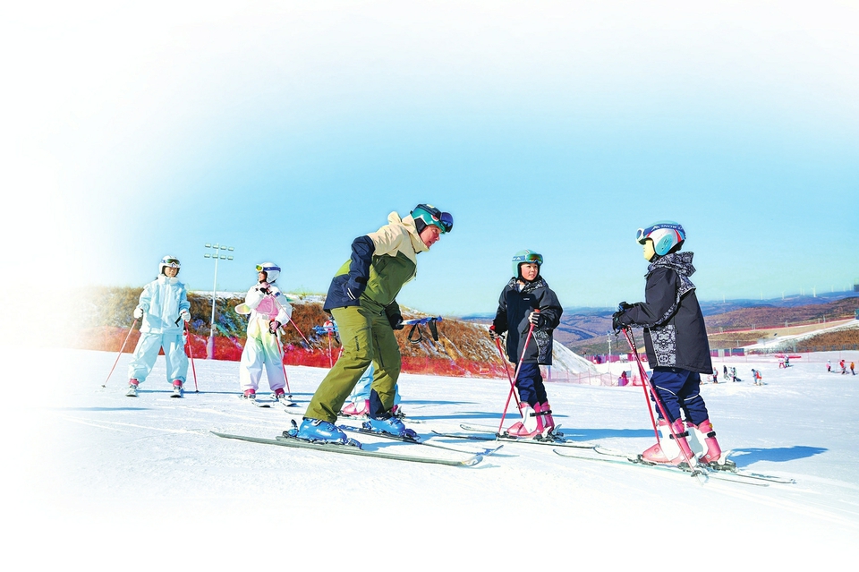 弗里茨·施特羅布(中)為小學(xué)生示范滑雪動作。本欄圖片:吳艷斐攝
