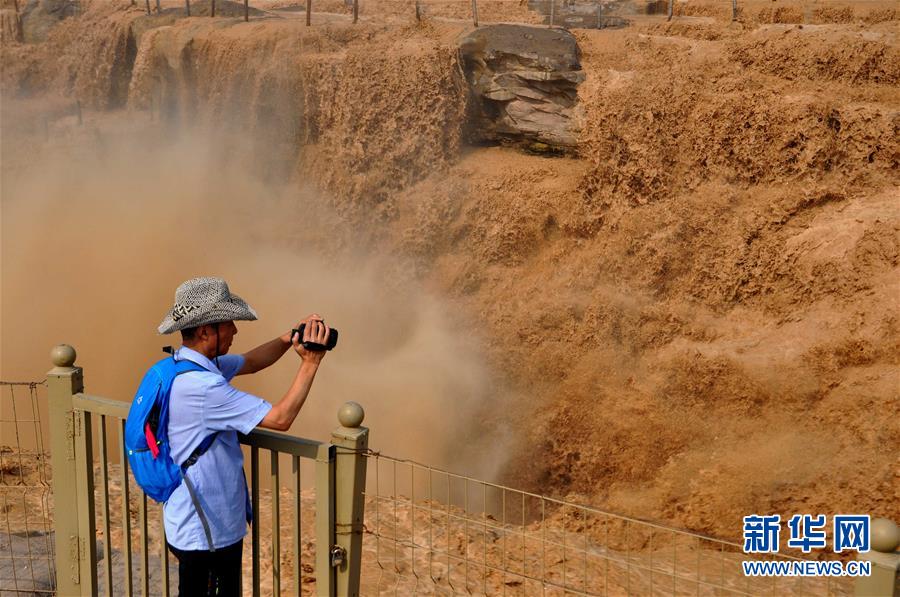7月4日,一名游客在山西吉縣拍攝奔騰洶涌的黃河壺口瀑布。當(dāng)日,受上游降雨和水庫(kù)調(diào)節(jié)放水影響,黃河晉陜峽谷迎來入汛以來第一次漲水,壺口瀑布水量大增,再現(xiàn)壯美大瀑布,吸引了眾多游客。新華社發(fā)(呂桂明 攝)