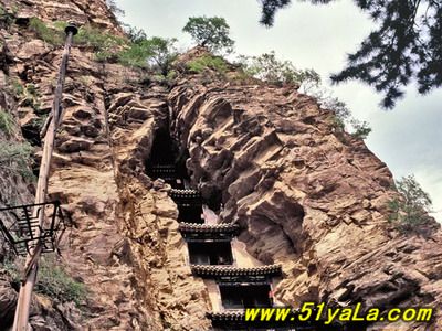 北洞是主體建筑部分。中區(qū)有大殿三間,座北向南。原為道教三清塑像,后被佛教改成三世佛。左右耳殿,另有東西配殿各三間,南閣一間。東側(cè)迎面山壁上,自然形成龐大的三角形石縫,內(nèi)有天然石洞,景觀奇特。石縫上端,外建五層樓閣。依崖開鑿卯洞,梁架結(jié)構(gòu)與崖石交接構(gòu)筑,建造精巧。閣內(nèi)設(shè)有鐵索,扶鐵索可攀援而上。在閣的東邊又有一洞,內(nèi)建殿三間,名九仙女閣,塑九仙女像。箭閣外塑趙杲泥像,頭頂距石崖僅二指半,故舊稱“趙杲觀,離天二指半”。再往南,就是趙杲觀最險峻的景觀了。峭峰高處,半山腰中,山洞前面,建樓三間。一眼望去,高閣懸空,上峭崖,下絕壁,左右山石如刀削。上下左右根本無路可通。山洞中垂下一條長約20米的鐵索,成了進(jìn)洞的唯一途徑。只有勇敢的虔誠者或探險者,方可垂直攀索而登,一般人只能望樓興嘆,故鐵索被譽為“仙閣云梯”。三層樓建筑后依山洞,前為磚木結(jié)構(gòu)。上層內(nèi)塑太上老君、無始天尊、通天教主。中層內(nèi)塑關(guān)圣帝君。下層供修持者居住。當(dāng)時修筑情景,真令人難以想像。北洞群落,地形險要,峰巒競秀,古木參天,峭峻幽邃,設(shè)計大膽,造型奇特。人夸“雁北懸空寺,不及代州趙杲現(xiàn)”說的并不過分。