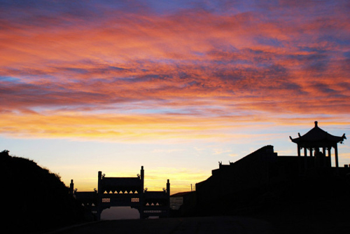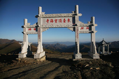 望海峰的盛景在于東觀日出。由于東面再無大山阻擋,所以人的目力可東眺非常遙遠的地方。峰頂曾建有望海樓,專門為觀景而建??上昃靡褮?,1985年重建,為望海寺,內(nèi)供聰明文殊。有史籍記載日出之壯麗景象:“每當蒸云寢壑之隙,爽氣澄秋之際,于日出扶桑之時,可望紅日十倍于車輪,紅輪之下,隱隱水光閃爍,若波若鏡,瑰麗非凡。1977年8月,趙樸初先生登東臺觀日出后乘興填詞《五臺雜詠·調(diào)寄憶江南》,形象描繪了東臺日出之勝景: