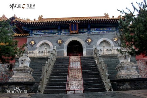 全寺占地四十五畝,順山就勢(shì)而筑殿宇,布局嚴(yán)謹(jǐn)。寺前有石階一百零八級(jí)。山門(mén)內(nèi)有天王殿、鐘鼓樓、大雄寶殿等建筑。各殿均用三彩琉璃瓦覆蓋。又,寺內(nèi)有康熙御碑,方座螭首,矗立在前院;乾隆御碑在東禪院碑亭內(nèi),以方形巨石雕成,高六公尺,每面寬一公尺,上刻漢、滿(mǎn)、蒙、藏四種文字。