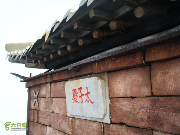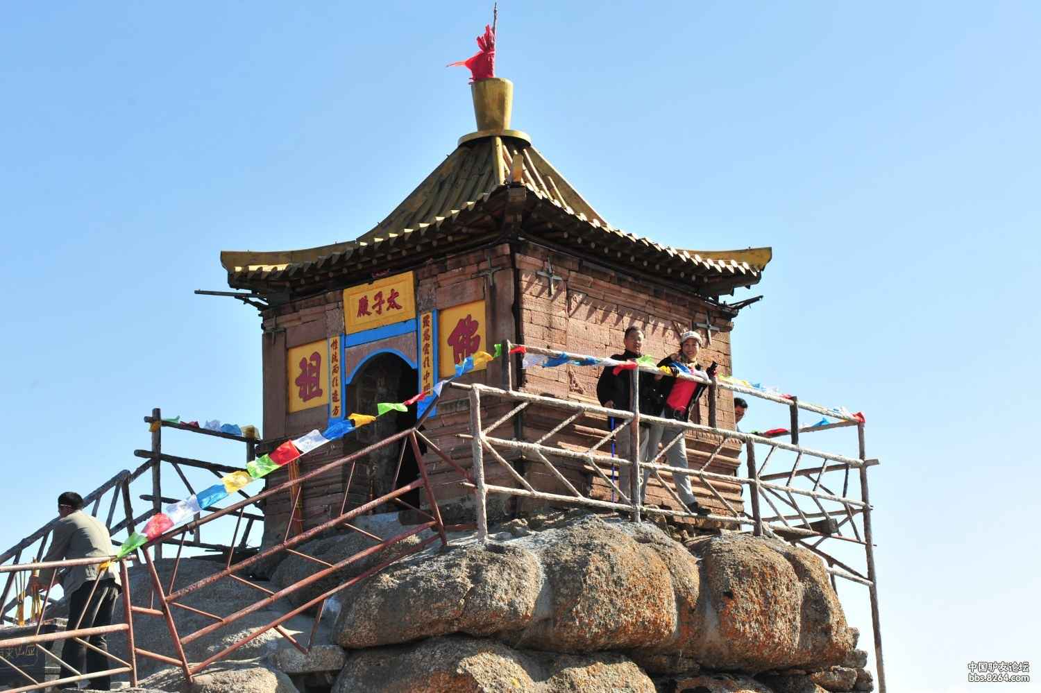 蘆芽山主峰絕頂周方僅約10平方米的石坪上,巍然托起一座正方體狀石砌建筑,這便是太子殿。三面懸崖,甚為險(xiǎn)峻。因其位居群山之極,數(shù)十里外即可看到。太子殿為石壁構(gòu)筑,殿脊有一鐵棍直指蒼穹,似為避雷特置。殿頂向四面披散,原以銅瓦鋪蓋,今已遺失。殿門北向而開,門據(jù)有石鑿“太子殿”三字赫然醒目。兩側(cè)墻壁又鑿“佛祖”二字,工整雄勁。殿門兩側(cè)石刻聯(lián)語系光緒年間白文良倡修該殿時(shí)書鑿,句為:復(fù)慈云于中國(guó),性潔雨于邊方。著名書法家黃克毅有詩贊太子殿景致: