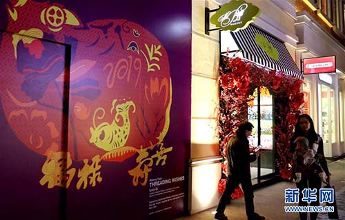 行人從香港街頭的吉祥“豬”畫旁走過(1月23日攝)。 農(nóng)歷豬年臨近,香港街頭裝扮得流光溢彩,喜氣盈盈。 新華社記者 吳曉初 攝