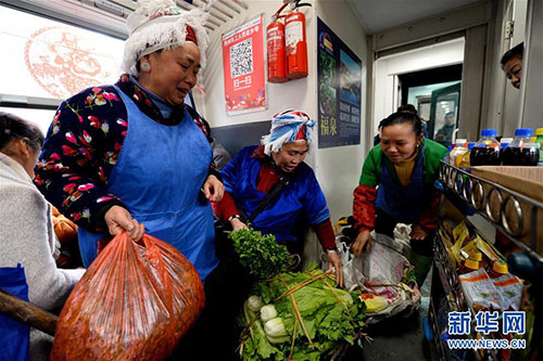 1月27日,乘客在5639次列車上賣(mài)菜。 由貴州玉屏開(kāi)往貴陽(yáng)的5639次列車是輛綠皮“慢火車”。沿途群眾每天挑著籮筐上車,將自家出產(chǎn)的農(nóng)作物帶到貴陽(yáng)、凱里等地販賣(mài),再坐著火車把生產(chǎn)資料和日用品帶回家。時(shí)間一長(zhǎng),不少乘客直接在列車上買(mǎi)賣(mài)貨物。春節(jié)將至,蔬菜水果等農(nóng)產(chǎn)品交易較往日更加紅火,列車上的“年貨市場(chǎng)”洋溢著濃濃年味。 新華社發(fā)(許毅 攝)
