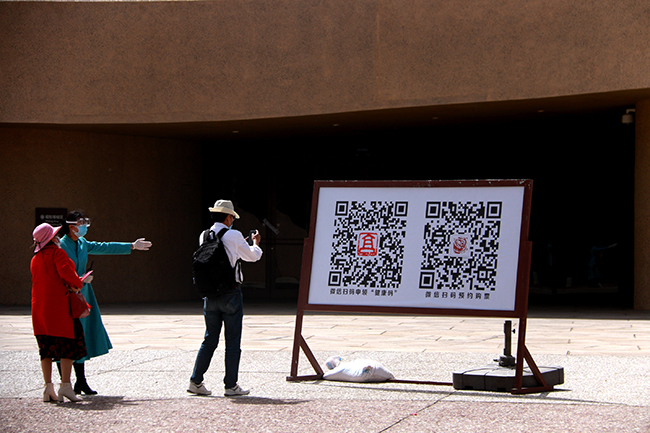 10日上午9點,在敦煌莫高窟數(shù)字展示中心門票業(yè)務辦理處,幾十名游客正在“1.5米線”排隊等候測溫登記,在通向窟區(qū)的擺渡車上,游客按照間隔就座。游客申領國家或者甘肅省的“健康碼”后,可預約購買10日內(nèi)的門票。