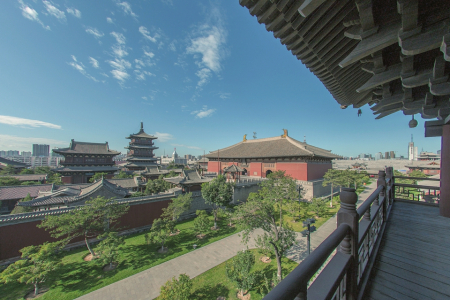 華嚴(yán)寺始建于遼重熙七年(公元1038年),其名取自佛教經(jīng)典《華嚴(yán)經(jīng)》中“慈悲之華,必結(jié)莊嚴(yán)之果”。寺院坐西向東,山門、普光明殿、大雄寶殿、薄伽教藏殿、華嚴(yán)寶塔等30余座單體建筑分別排列在南北兩條主軸線上,布局嚴(yán)謹(jǐn),規(guī)模宏大,占地面積達(dá)6.6萬平方米,是我國(guó)現(xiàn)存年代較早、保存較完整的一座遼金寺廟建筑群,1961年被國(guó)務(wù)院公布為第一批全國(guó)重點(diǎn)文物保護(hù)單位,2014年被評(píng)為國(guó)家4A級(jí)旅游景區(qū)。
