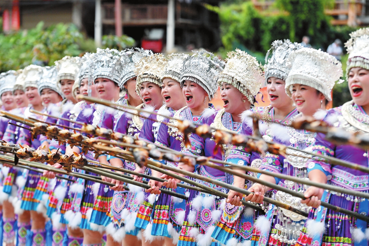 近年來(lái),廣西柳州市融水苗族自治縣充分利用當(dāng)?shù)刭Y源,推動(dòng)漁旅融合發(fā)展,助力鄉(xiāng)村振興。圖為10月18日,村民們向游客展示剛剛燒好的魚(yú)。 新華社記者 黃孝邦攝