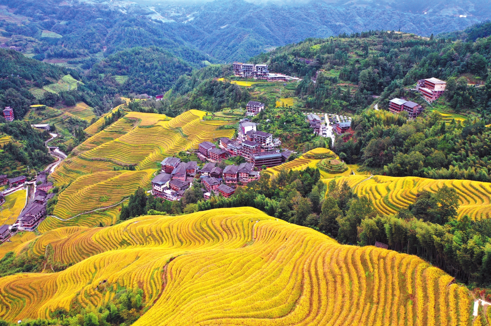 這是廣西龍勝各族自治縣龍脊梯田及其間村寨風(fēng)貌(10月22日攝)。