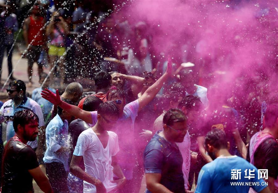 胡里節(jié)也叫“灑紅節(jié)”,人們?cè)谧约耗樕虾蜕砩贤可项伭?,還向別人拋撒五顏六色的顏料和粉末,迎接春天的到來(lái)。新華社發(fā)(吳昂 攝)
